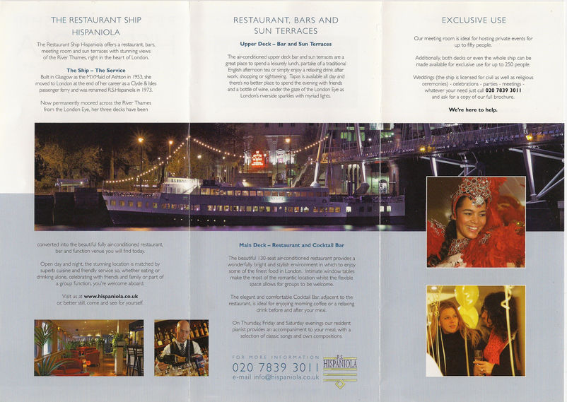 From a private dining-club, she became a public restaurant and she rather flourished in that role. Later she was moved down river, east of Hungerford Bridge to a berth close to an old Clyde consort, QUEEN MARY, In the spring of 2002, HISPANIOLA was sold to City Cruises by the Yardarm Club, and was towed to the George Prior yard at Ipswich for a hull inspection and a refit. She is back at her berth and back in business, under the shadow of the London Eye.