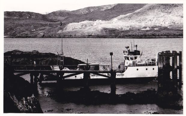 The largest vessel ever to serve at Scalpay, Scalpay (II) is shown here at the island's slipway in 1972. In a major refit at Shandon in October 1971 for the Scalpay service - in the course of which she was renamed and formally transferred to David MacBrayne Ltd - angled ends were cut into her ramps to suit the somewhat narrow slipways, and this is clearly shown in the photograph.